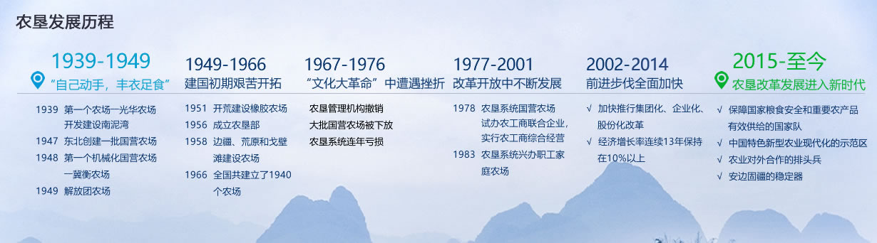 Since the People's Republic of China was founded, under the leadership of predecessors of proletarian revolution represented by Chairman Mao, the pioneers consisted of demobilized soldiers, intellectuals and border-supporting youths went to the frontier and wilderness to reclaim wasteland and build state farms. The development of China State Farm is broadly divided into five stages: