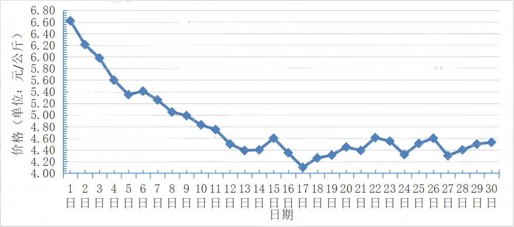 11月,全國重點監(jiān)測農(nóng)產(chǎn)品批發(fā)市場香蕉總交易量達(dá)2.2萬噸,同比下降8.3%,環(huán)比下降4.3%;總交易價值10895.6萬元,同比下降24.6%,環(huán)比下降12.1%。日平均價格最高為6.6元/千克,最低為4.3元/千克,全月平均價格為4.7元/千克,同比下降24.9%,環(huán)比下降2.1%(每日價格變化如圖)。