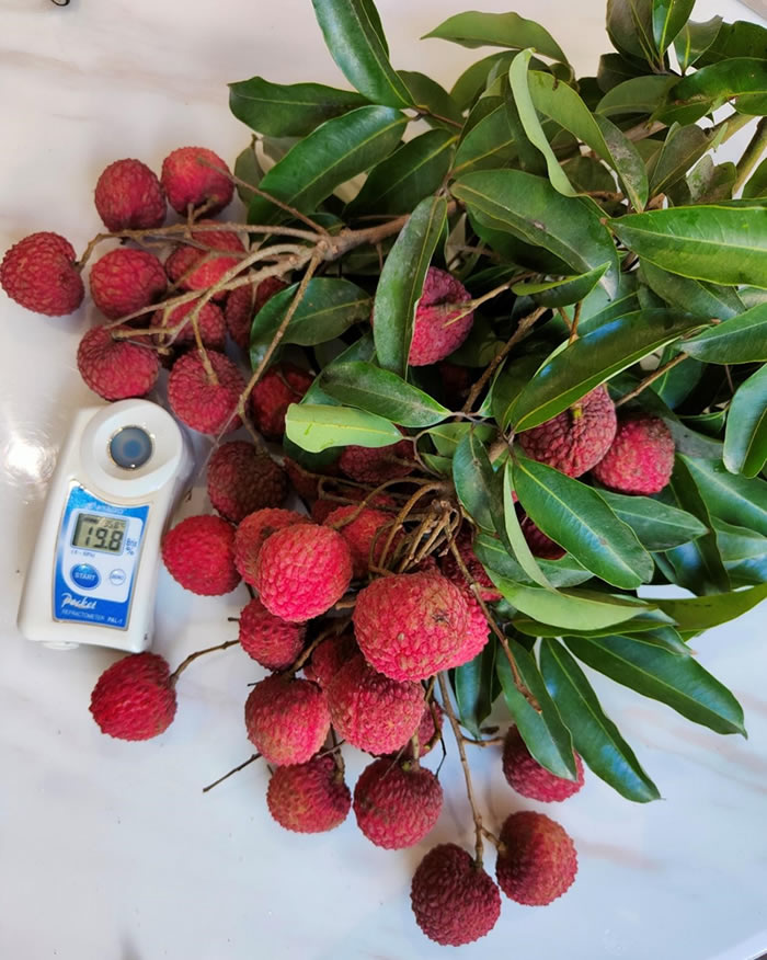 專家組在福建省漳州市云霄縣東廈鎮(zhèn)東崎村清堯家庭農(nóng)場進(jìn)行現(xiàn)場測產(chǎn)與品質(zhì)鑒定,認(rèn)真聽取了選育團(tuán)隊(duì)對(duì)‘鳳山紅燈籠’荔枝新品種選育情況的匯報(bào),就有關(guān)問題進(jìn)行了質(zhì)詢與討論,經(jīng)現(xiàn)場測產(chǎn),2003年高接的18年生樹平均株產(chǎn)108.4kg、折合畝產(chǎn)1518.1kg、平均單果重22.2g、 焦核率82.0%、可溶性固形物19.1%、可食率84.3%;果實(shí)肉質(zhì)細(xì)嫩、清甜多汁,品質(zhì)優(yōu)。一致同意該品種通過現(xiàn)場鑒評(píng)。