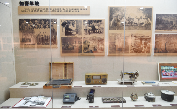 “憶往昔/崢嶸歲月”展廳。主要以廣西農(nóng)墾發(fā)展歷程為主線,展示了廣西農(nóng)墾自1951創(chuàng)建至2015年期間,在種植橡膠、安置歸僑及庫區(qū)移民、社會事業(yè)、體制改革和產(chǎn)業(yè)發(fā)展等方面的崢嶸歷史以及取得的輝煌成就。在新中國成立之初,為了打破美帝國主義對我國的經(jīng)濟(jì)封鎖和禁運(yùn),解決橡膠的生產(chǎn)供應(yīng)問題,黨中央做出“在華南地區(qū)建立天然橡膠生產(chǎn)基地”的重大決策,1951年10月,廣西在省農(nóng)林廳設(shè)立墾殖處,專管廣西的植膠工作,廣西農(nóng)墾由此走上歷史舞臺。這一篇章的“農(nóng)墾大家庭”講述了軍墾、知青、歸僑、移民在農(nóng)墾屯墾戍邊、種植橡膠、發(fā)展生產(chǎn)等艱苦創(chuàng)業(yè)故事?!爱a(chǎn)業(yè)奠基”部分講述了20世紀(jì)60年代,廣西農(nóng)墾除橡膠主業(yè)外,開展多種經(jīng)營,建立了一批豬場、糖廠、水果加工廠等工業(yè)項(xiàng)目,進(jìn)入了農(nóng)墾發(fā)展工業(yè)的初創(chuàng)階段,建立了廣西第一個機(jī)械農(nóng)場、第一個奶牛場、第一家淀粉廠等,還生產(chǎn)出了廣西第一瓶走進(jìn)人民大會堂的礦泉水——“茶花山”礦泉水?!绑w制創(chuàng)新”部分則講述了十一屆三中全會后,廣西農(nóng)墾通過全面推行農(nóng)工商綜合經(jīng)營,興辦職工家庭農(nóng)場等形式,改變了當(dāng)時農(nóng)場單一經(jīng)營農(nóng)業(yè)格局和企業(yè)統(tǒng)收統(tǒng)支的財(cái)務(wù)管理體制,并將墾區(qū)的優(yōu)勢產(chǎn)業(yè)資源進(jìn)行整合,相繼組建了糖業(yè)、畜牧、劍麻等六大產(chǎn)業(yè)集團(tuán),興辦了一批產(chǎn)業(yè)園區(qū),積極向集團(tuán)化、公司化轉(zhuǎn)變,為廣西農(nóng)墾集團(tuán)打造現(xiàn)代一流食品企業(yè)奠定了堅(jiān)實(shí)基礎(chǔ)。“社會擔(dān)當(dāng)”部分,講述廣西農(nóng)墾承擔(dān)的教育、醫(yī)療衛(wèi)生、人民武裝等社會職能,在保障和改善民生方面做了大量的工作的同時,積極發(fā)揮安邊固疆穩(wěn)定器的作用,在1979年對越自衛(wèi)還擊戰(zhàn)中,邊境農(nóng)場有上萬名民兵支前參戰(zhàn),有21個單位和181人立功獲獎;隨著中央關(guān)于剝離企業(yè)社會職能工作的不斷推進(jìn),除了廣西職業(yè)技術(shù)學(xué)院這所公辦高校被保留至今,其他社會職能都已先后從農(nóng)墾剝離出去。