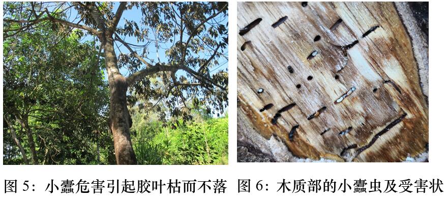 小蠹蟲危害后,其受害部位顯現(xiàn)流膠、針錐狀蛀孔、黃褐色木質(zhì)粉末,嚴(yán)重時(shí)莖干遍布蛀孔和粉柱、粉末等癥狀。鑒于寒害也會(huì)出現(xiàn)膠樹流膠,需注意區(qū)分寒害流膠與蟲害流膠。小蠹蟲危害的流膠部位主要分布于膠樹樹干開割部位及其上下30—50厘米范圍內(nèi),嚴(yán)重時(shí)才會(huì)分布在膠樹其他位置或者未開割膠樹,將膠線拉開,可看到小蠹蟲造成的圓形蛀孔,如果是新蛀的,則可看到水漬狀的圓形蛀點(diǎn);寒害流膠的部位可分布于膠樹樹干任意位置,甚至是樹枝上,將膠線拉開,可以明顯看出流膠部位出現(xiàn)細(xì)小的裂縫或爆皮。
