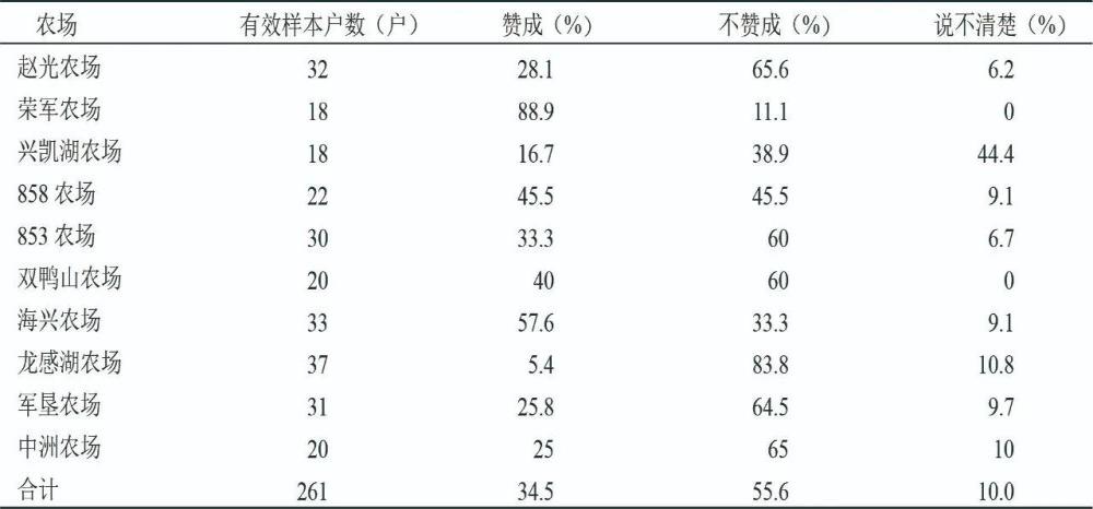 表2數(shù)據(jù)顯示,總體上,有55.6%的土地承包租賃戶不贊成農(nóng)場收回土地實行集中統(tǒng)一經(jīng)營,只有1/3的戶贊成農(nóng)場收回土地實行集中統(tǒng)一經(jīng)營。分農(nóng)場看,榮軍農(nóng)場絕大多數(shù)土地承包租賃戶贊成由農(nóng)場集中統(tǒng)一經(jīng)營,反對的比例很低;湖北3個農(nóng)場反對收回土地由農(nóng)場集中統(tǒng)一經(jīng)營的比例明顯高于贊成的比例,龍感湖農(nóng)場贊成的比例僅為5.4%。榮軍農(nóng)場贊成集中統(tǒng)一經(jīng)營的比例高,主要是因為榮軍農(nóng)場以農(nóng)地模擬股份制形式實行了農(nóng)業(yè)生產(chǎn)統(tǒng)一經(jīng)營核算。