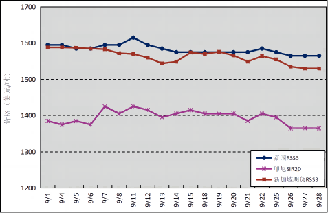 國外主產(chǎn)區(qū):9月,泰國RSS3平均價格為1583美元/噸,環(huán)比上漲87美元/噸,最高價為1615美元/噸,最低價為1565美元/噸;印尼SIR20平均價格為1395美元/噸,環(huán)比上漲130美元/噸,最高價為1425美元/噸,最低價為1365美元/噸;新加坡RSS3期貨主力合約月均結(jié)算價格為1564美元/噸,環(huán)比上漲85美元/噸,最高價為1588美元/噸,最低價為1530美元/噸。