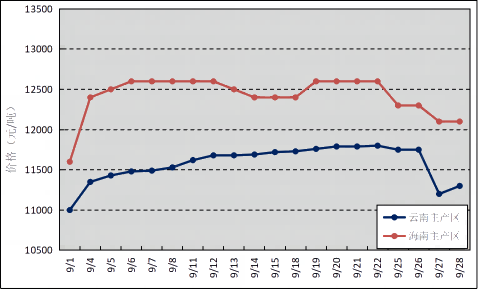 國內(nèi)主產(chǎn)區(qū):9月,國內(nèi)產(chǎn)區(qū)受反復(fù)降雨天氣影響,割膠工作進程放緩,膠水產(chǎn)出偏少,拉漲原料價格。云南和海南原料膠(折干膠)月均價格分別為11577元/噸、12420元/噸,環(huán)比上漲1068元/噸、1718元/噸。